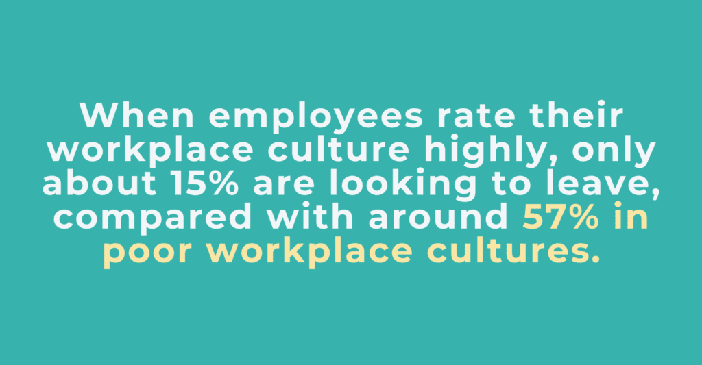 - When employees rate their workplace culture highly, only about 15% are looking to leave, compared with around 57% in poor cultures (SHRM).